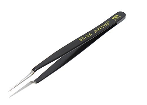 Artis Tweezers style SS-SA. Extra long tweezers with fine points. Length: 5.25" (135mm). Very strong and fine tips and additional length. Length: 5" (130mm). The tweezer is one of the longest standing and most important staples of every work bench and Aven's innovative Artis Tweezers have set a new precedent for precision. Aven's cutting edge design features a angled bend at the end of the tip, which provides a softer overall grip with a large surface area that reduces hand fatigue, enhancing productivity. The durable tweezers are protected by an attractive ESD safe coating and the highly polished stainless steel tips with rounded edges allow operators to handle very fine wire, miniature parts, electrical components and other delicate materials in a confined space with reduced risk of damage. Artis Tweezers style SS-SA. Extra long tweezers with fine points. Length: 5.25" (135mm).