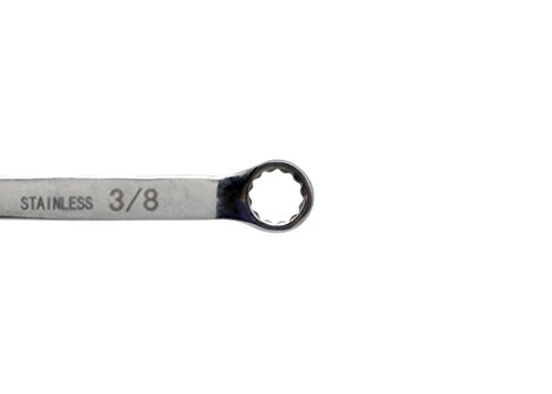 Combination wrench 3/8' made from 420 series stainless steel. These wrenches can be autoclaved up to 250 degrees Fahrenheit. The open end is angled at 15 degrees and the other end is a 12 point box end that is offset at 15 degrees. Eliminates risk of ferrous contamination in the maintenance and operation of process equipment in clean rooms, food service and health care industries.