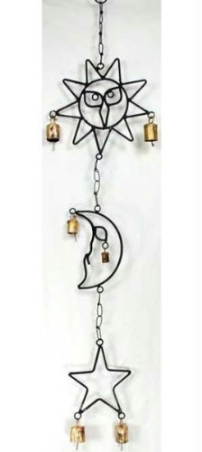 Crafted of wrought iron, this wind chime links together three icon images of a sun, a moon, and a star. Each features two copper bells that ring with a light, jingling music.