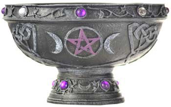 A wonderful scrying bowl depicting the triple moon symbol of the goddess with large central, full moon containing a pentacle. The rest of the bowl is further decorated with Cletic Knotwork and simulated gems. Measures approx. 3" high x 5" across the opening.
