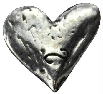 A small, heart shaped, pewter pocket stone decorated with tiny swirls.
