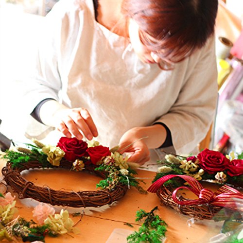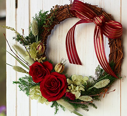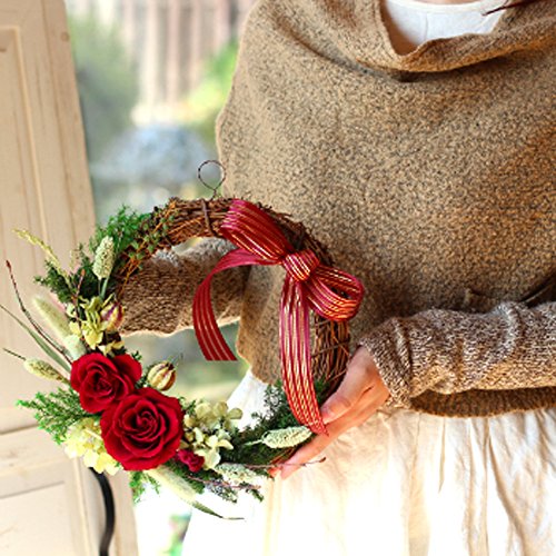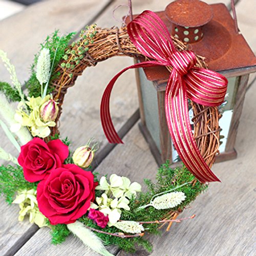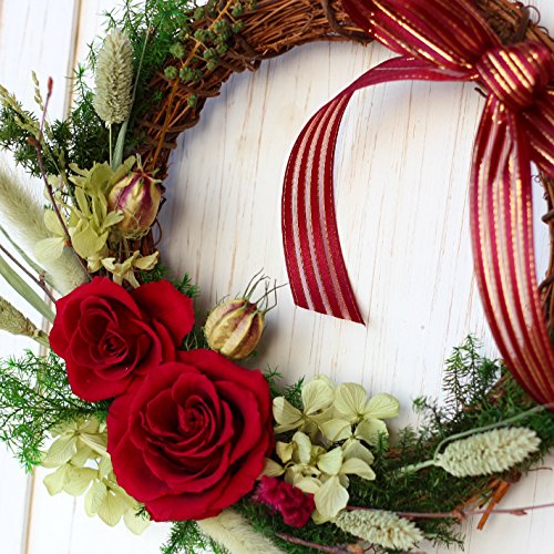 - 真っ赤な大輪バラで華やかさを、サンキライリースでどこかカントリーな雰囲気があるリースとなっています。普段のお部屋、クリスマスの飾りつけにもご利用いただけます。