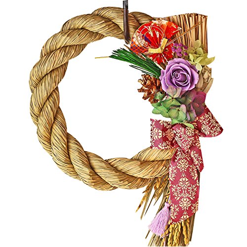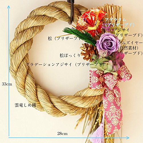 - 【自然素材】アゲラタム、ラムズイヤー【プリザーブドフラワー】バラ、グラデーションアジサイ、松【その他】松ぼっくり、扇、柄入りリボン、房付き紐、稲穂付き特大雲竜しめ縄
