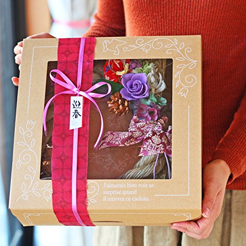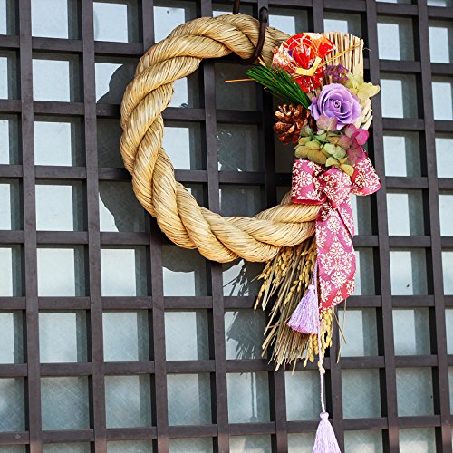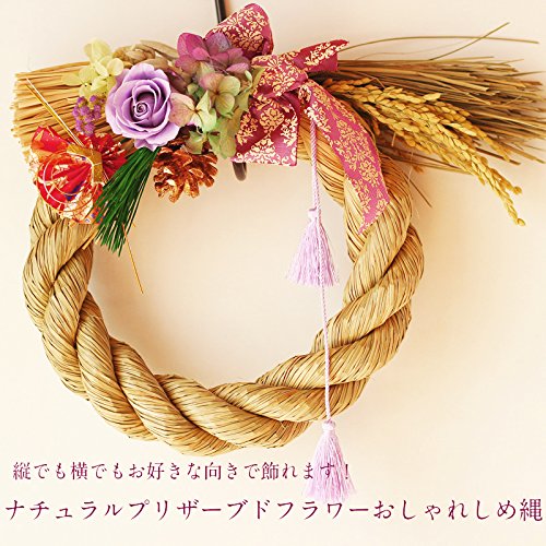 - 派手すぎず、地味過ぎず、新年を程よく彩る花としめ縄のリースになります。プリザーブドフラワーの資格をもつデザイナーが手掛ける他にはない正月飾りです。