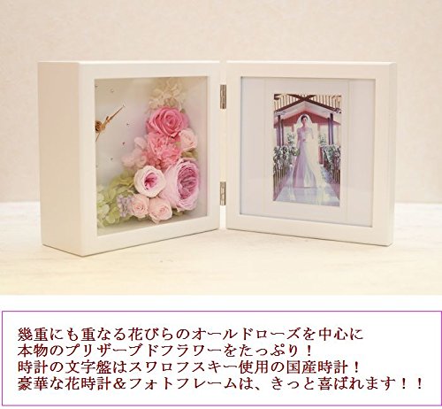 - スワロフスキーの文字盤とオールドローズのプリザーブドフラワー時計とフォトフレームが一つになり、素敵なインテリアアイテムとして幸せな空間を作ります。結婚式でのご両親様への贈呈用に最適品です!ウェディングのお写真を入れて贈られてみてはいかがでしょうか♪