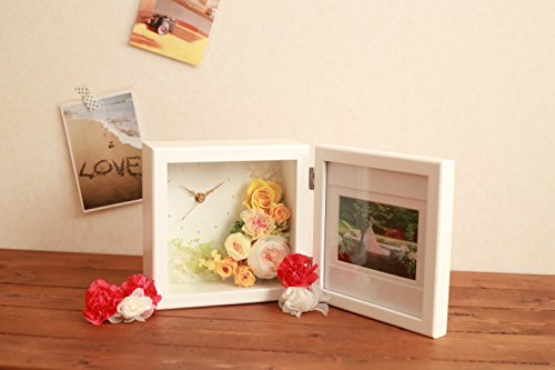 - スワロフスキーの文字盤とオールドローズのプリザーブドフラワー時計とフォトフレームが一つになり、素敵なインテリアアイテムとして幸せな空間を作ります。結婚式でのご両親様への贈呈用に最適品です!ウェディングのお写真を入れて贈られてみてはいかがでしょうか♪