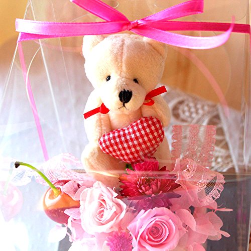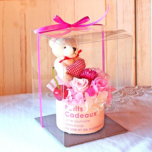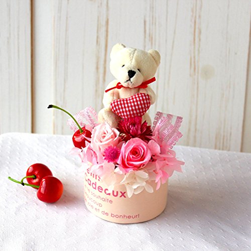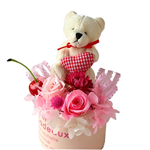 - 陶器にピンク色のお花とさくらんぼの中にクマがちょこんと座っているとてもキュートなアレンジです!ちょっとした贈り物にもおすすめです!