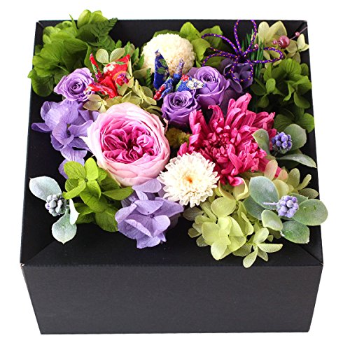 - 【プリザーブドフラワー】オールドローズ、輪菊ピンポンマム、バラ、アジサイ、ソフトイモーテル 【その他】ベリー(アーティフィシャル)パールボール、アクリルハートピック、ちりめん夫婦鶴、紙製box