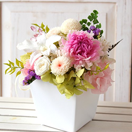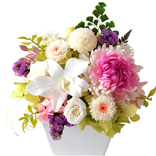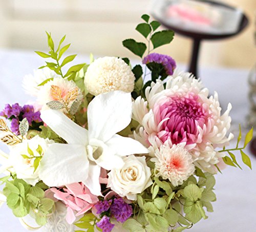 - 大輪の輪菊とデンドロビュームの蘭を中心に和風でありながらモダンで華やかなアレンジです。本物のプリザーブド花材をたっぷり使用し、色合い・和のたたずまいは、凛とした上品さがあります。