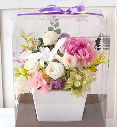 - 【プリザーブドフラワー】輪菊、ラン(デンドロビューム)アジサイ、ピンポンマム、マムミルフィーユ、スターチス、ラスカス、シルバーデージー、アジアンタム、シャーロット 【その他】オーガンジーリボン、白色艶消しの陶器