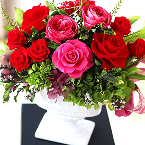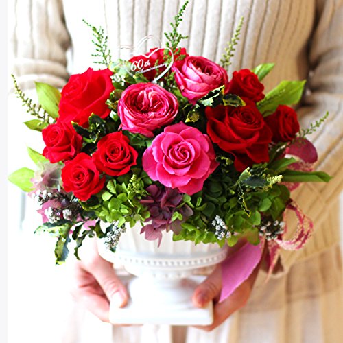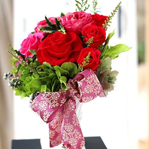 - プリザーブドフラワーだけのラグジュアリーなバラのアレンジ。大輪赤バラとグラデーションピンクのオールドローズにグリーンと小花、アジサイの豪華アレンジ。フォーマルな花贈りにもお使いいただけます。