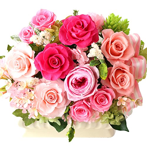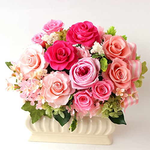 - 【プリザーブドフラワー】バラ、アジサイ、ヘデラ、アイビー、クリスパム、アジサイ、ピトスフォラム 【その他】サテンピンクストライプリボン、小花、ホップ(アーティフィシャル) 【器】ホワイトアイボリー横長陶器