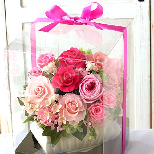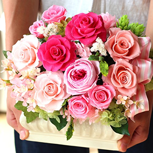 - 思わずうっとりしてしまうようなピンク系のバラがこぼれ落ちそうなほど入ったブーケのようなアレンジです。華やかで贅沢なアレンジは大切な方への贈り物にいかがでしょうか。