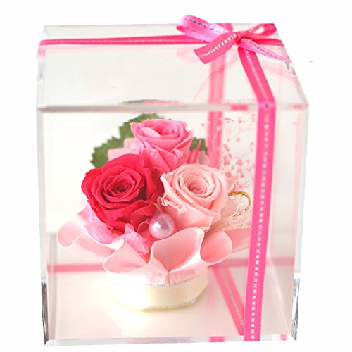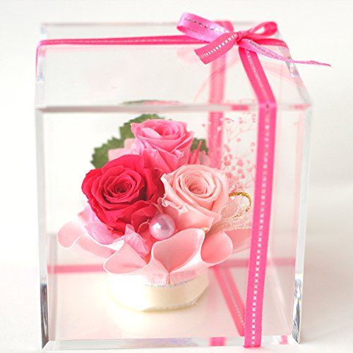 Azurosa(アズローザ) プリザーブドフラワー ギフト枯れない花 バラ アジサイ クリアキューブ ピンク 【ラッピング リボン 済み】