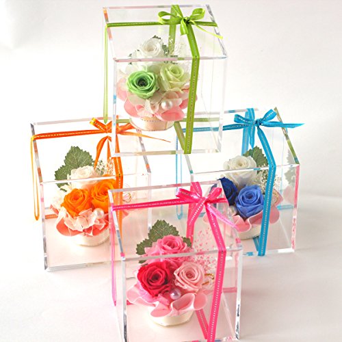 - アクリルのクリアキューブに入ったプリザーブドフラワーに同色のサテンリボンでラッピング!割れる心配がないのでデスクの傍らのインテリアにいかがでしょうか。
