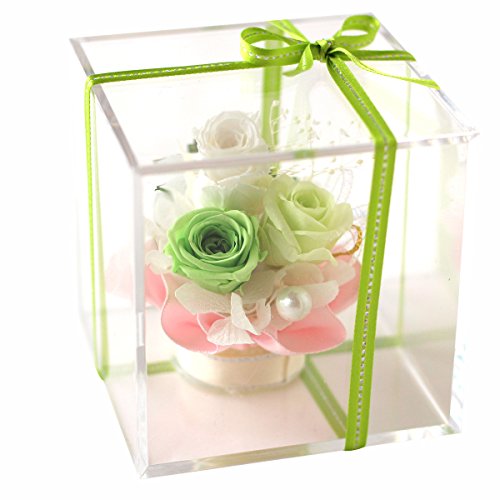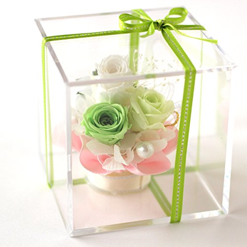 - アクリルのクリアキューブに入ったプリザーブドフラワーに同色のサテンリボンでラッピング!割れる心配がないのでデスクの傍らのインテリアにいかがでしょうか。