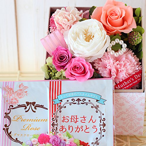- オールドローズを中心に、プリザーブドフラワーのバラをたっぷりと使ったナチュラルなフラワーボックス。カーネーションとバラの入浴剤セット付き♪