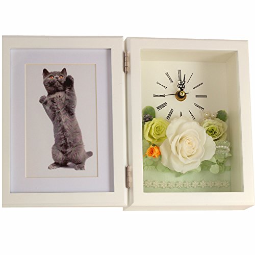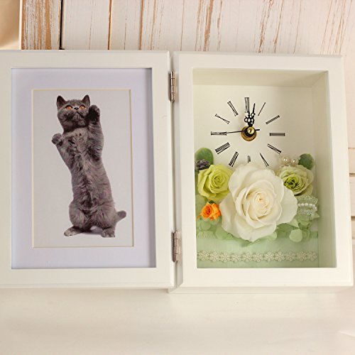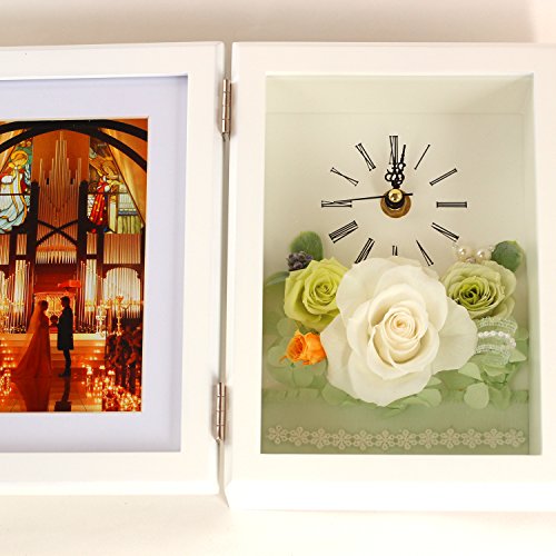 - 白色フレームの花時計と写真立てプリザーブドフラワーピンク。流れるように時を刻む花時計&フォトフレーム Lサイズが贈り物にぴったり!