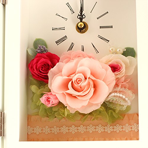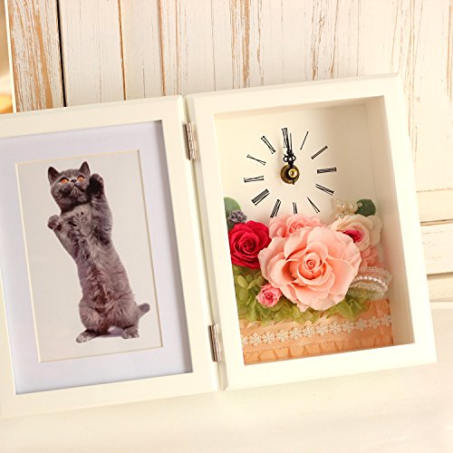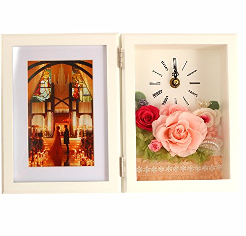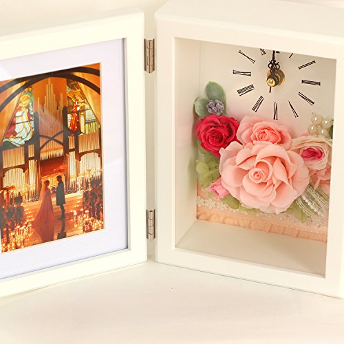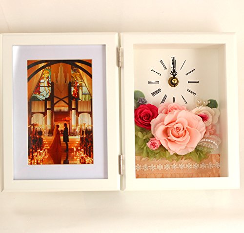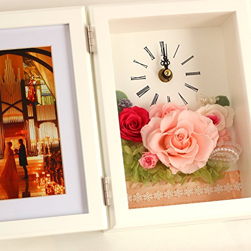 - 白色フレームの花時計と写真立てプリザーブドフラワーピンク。流れるように時を刻む花時計&フォトフレーム Lサイズが贈り物にぴったり!