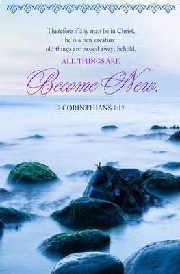 Celebrate the New Year with All Things Become New bulletins. Therefore if any man be in Christ, he is a new creature: old things are passed away; behold, all things are become new. 2 Corinthians 5:17 (KJV) The bulletin is shown folded (8.5 in. X 5.5 in.), exactly as church members and visitors will receive it. Worship bulletins arrive packaged flat 8.5 in. x 11 in. to fit into your printer or copier; shrink wrapped in packages of 100. The back is blank to print your own information.