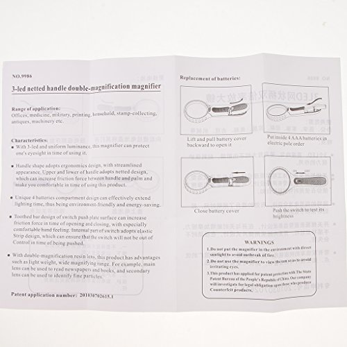 - 3個のLEDライトで拡大鏡、4個の単4電池で駆動(バッテリーは含まれません)