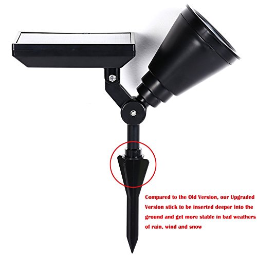 Adjustable Light and Solar Panel - Full range adjustable light angle to illuminate perfect spot and adjustable solar panel angel for optimum sun exposure. Compared to the Old Version, our Upgraded Version lengthen the stick to be inserted deeper into the ground and get more stable in bad weathers of rain, wind and snow; additionally, the Upgraded Version enhance the brightness up to 200 lumen from 80 lumen, by enlarging the solar panel and the battery capacity. It would be a better solution for landscaping your environment by illuminating flag, tree, garden, yard, pathway, etc.