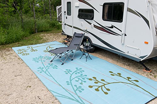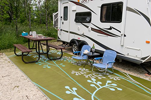 Reversible pattern between front and back sides. Perfect way to finish camping/RV set up. Made from highest grade of UV coated polypropylene material for weather and fade resistance. Heavy-duty piping on two sides with reinforced corners and stake loops(stakes not included). Easy to Clean. The yarn does not absorb dirt or stains. Leaves, mud or food spills are easily rinsed away with water and soap. Carefree and Weather proof. The rugs do not trap water, so they won't mildew. The tubular yarn is breathable and hence the mat will not kill the grass it is sitting on. The multipurpose mat can fold up small and flat, comes with a carry bag making it compact to carry on trips. Great solution for the the patio, under the awning of your RV, camping, tailgate parties, beach, boating, by the pool and/or on the deck.