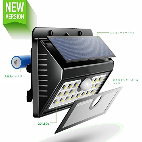 改良版: より明るい LEDライトを20つまで増加し、ソーラーパネルの改善を通じて、以前より明るくなり、照明の範囲も広くなります。 より良い防水性 2つの膜が備えられ、密閉ループの追加を通して、防水性能が向上しました。(防水ですが、完全に水に沈むと、壊れる可能性があります。) 広くなったセンサー範囲 サーボールヘッドを大きくなり、より多いエネルギーを得たので、センサー距離も長い、30フィートに達します。 三つの知能モード: 人感センサーと明暗センサーが搭載されます。三つの知能モード:常時点灯ライトモード、DIMモード、強い光センサモードがあります。必要によって、取り付けの前にモードを選択下さい。 ①常時点灯ライトモード:暗くなると、自動点灯し、蓄積した電力が切れるまで強く明るい光を提 供してくれます。 ②DIMモード:暗くなるとライトは薄暗く自動点灯しますが、人が近づくとセンサー感知でライトが 明るくなり、強点灯(15秒)します。 ③強い光センサーモード:普段は消灯しており、人が近づいて来ると、①と同じ光の強さで15秒光り、自動的にオフにします。 簡単設置: 配線がないので設置簡単です。形状も小形・軽量化され省施工です。定期的にランプを交換するメンテナンスの手間がないです。玄関先や庭先、またベランダ等の壁面に簡易に設置できます。(推薦の設置高度1.5m)できるだけ長時間、直射日光が当たるような日当たりの良い場所を選んでください。 適用場所: 表玄関、パーク、ポスト、ガーデン、縁側、ガレージ、パルコニー、遊び場、私道、路地、庭などのような室外場所に設置出来ます。 玄関、通り庭や夜、庭に出た際のちょっとした明り取りや裏庭に設置して防犯グッズとして使用するのにも最適です。 製品仕様 : LEDライト:20個 センサー距離:30フィート(約9m) 点灯モード:三種類 梱包内容: 本体x 1 コンクリートプラグx 1 木ネジx 1 取扱説明書x 1 保証 すべてのBANGWEIER製品はご購入日から12ヶ月間の保証がございます。製品に何らかの異常がございましたら、お気軽にお問い合わせください。キチンと保証サービスをご提供いたします。 注意事項: 一、昼間に変換された太陽エネルギーの量は、照明の性能を決定します。それは日光の強さ、使用者の地理位置、気象条件や季節などに応じて変化します。 二、防水ですが、雨と湿気に限られます。 三、ソーラーエネルギを最大得るため、太陽が完全に当たられる場所にインストールしてください。 四、曇りの日などは十分充電ができないのでライトの点灯時間が短くなる恐れがあると考えられます。 五、下記のようなソーラーパネルへの日射が著しく減少する場所では点灯時間が短いですので、設置に適しません。 ①午前9:00~午後3:00 の間、ソーラーパネルに影のできる場所。(ソーラーパネルの一部に影ができると太陽光を電気エネルギーに変換できません。) ②山岳地など冬季に積雪や雪の障害が発生する場所。 ③ソーラーパネルを南向きに設置できない場所。 ④落葉、粉塵、泥、鳥糞などによりソーラーパネルが汚される場所。