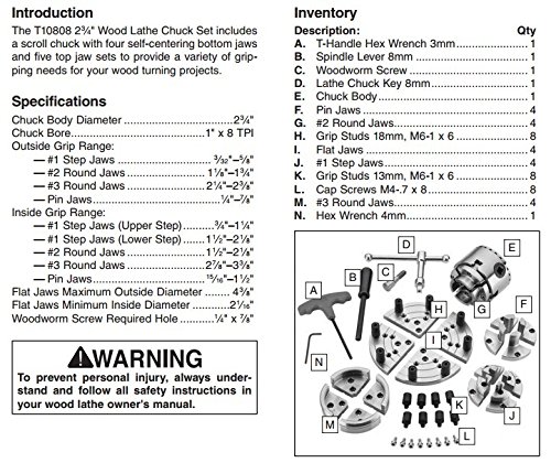 1.This Wood Lathe Chuck Set includes a 4-jaw self-centering chuck and interchangeable jaws for bowls, spindles, and hard-to-hold projects.