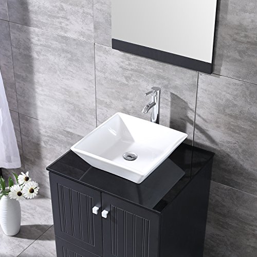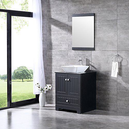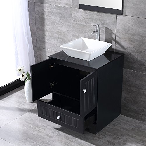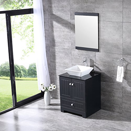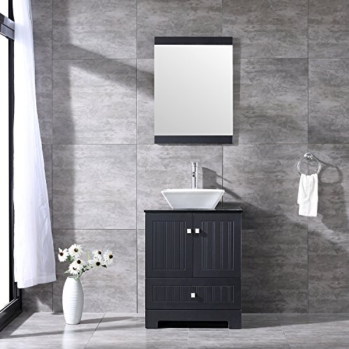 bathjoy 24 "ブラック浴室洗面化粧台キャビネットTop Squareセラミック容器シンク蛇口Drainコンボwithミラー洗面セット