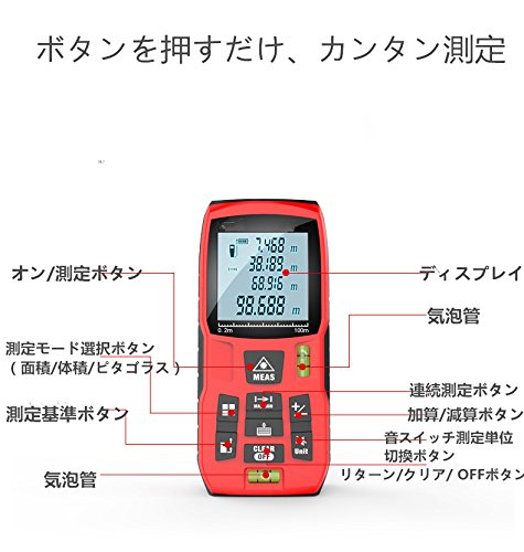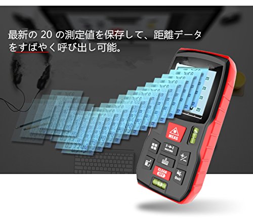- 測定機能:距離測定、体積・面積測定、体積測定、辺測定、連続距離測定、測定値の加算と減算、メモリー機能(最大20件)、IP54 (防滴、防塵) 級の密閉機能で、環境に対する強力な保護。