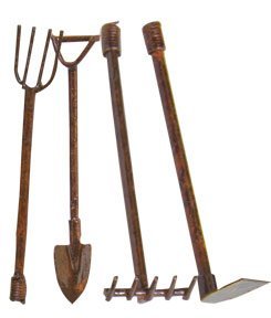 These tiny garden tools are the perfect finishing touch for spring-themed miniatures! Four piece set of rusty wire and metal tools: a shovel, rake, hoe, and pitchfork, each piece is just 2" long.
