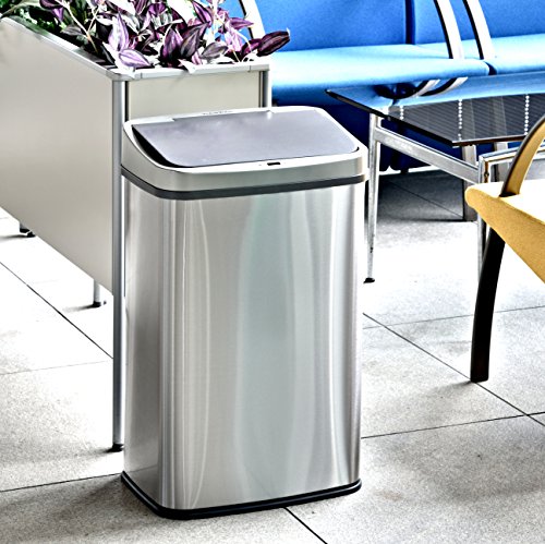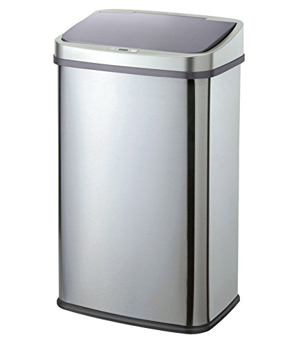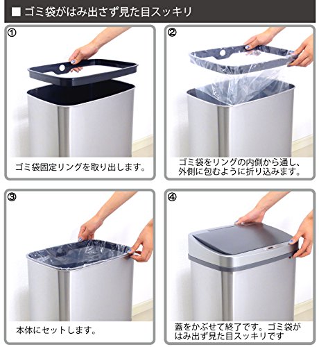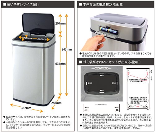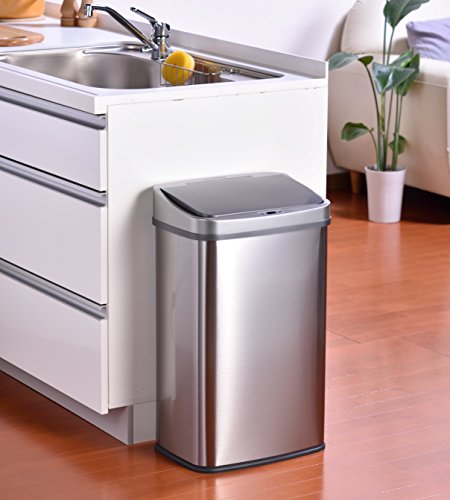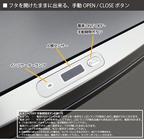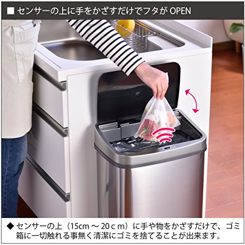 - 手をかざすだけでフタが自動開閉する、人感センサー付きのステンレス製ゴミ箱です。両手が塞がっていても、ゴミ箱に触れずにゴミを捨てれます。