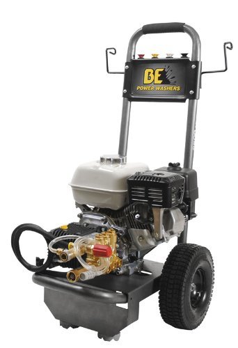 BE Pressure B2565HGS Gas Powered Pressure Washer, GX200, 2500PSI, 3.0 GPM. Features include durable powder coated steel frame and anti-vibration rubber foot and frame cutouts to easily change engine oil and External Unloader.