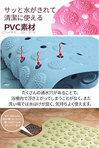 - 【バスタブの中でも使えるPVC素材のマット】バスタブの中や洗い場で、滑り止めや転倒防止用のバスマットです。凹凸面がちゃんとスリップ防止、マットの裏面には吸盤付でしっかり固定できるので安心して使えます。水切れが良く乾燥も早いPVC素材ですのでいつでも清潔に保つことができます。赤ちゃんからご年配の方、また妊婦さんなど幅広く安心してお使いいただけます。●浴室内で安心して使える裏面吸盤付のバスマット。 ●浴槽内や洗い場などすべりやすい場所に。 ●裏面吸盤付きでしっかり固定できる浴室用のノンスリップマット。浴室、バスタブ内でのスリップの防止に。 ●年配の方やお子様、妊婦さんがいるご家庭での使用に特におすすめ。表面の凸凹加工がスリップを防止します。 ●水切れがよく乾きの早い素材で清潔に保てます。周囲はめくれにくいラウンド加工になっています。