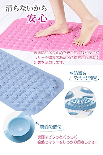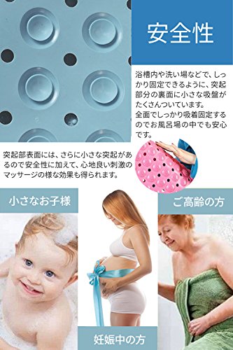 - 【環境にやさしい】 ・嫌なにおいがなく安心してお使いいただける素材です。【安全性】 ・浴室内や洗い場などで、しっかり固定できるように、突起部分の裏面に小さな吸盤がたくさんついています。 ・全面でしっかり固定するので、お風呂場の中でも安心です。 ・突起部表面には、さらに小さな突起があるので安産性に加えて、心地良い刺激のマッサージのような効果も得られます。 ・お子様やお年寄り、妊婦さんなどが滑って転倒するのを防ぎ安心です。