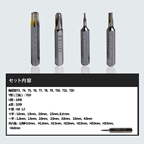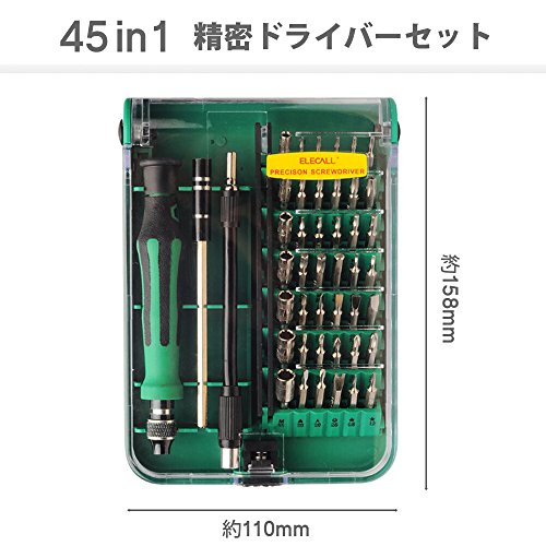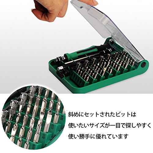 - 分解修理や組み立てに必要なビットがほとんど揃っており、専用ケース付なのでばらばらにならずに持ち運びにも便利です(注:ケースはフルオープンに開きます)。
