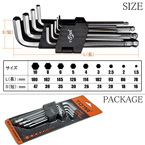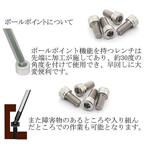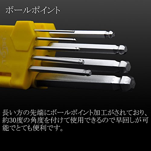 バイク、自転車の点検修理等のメンテナンス、日曜大工、家具の組み立てに。一般的な9種類のサイズで使いやすい。長い方の先端がボールポイント加工が施されておりますので、早回しが可能となっております。また、障害物のあるところや入り組んだところの作業が可能です。