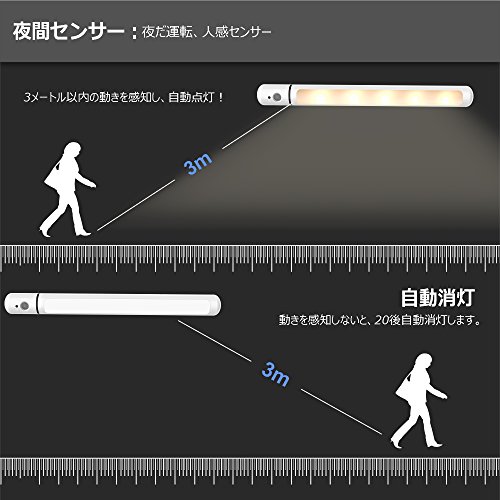 技術仕様 サイズ:25cm×2.5cm 重量:約65g 電池型:単3電池×3個(別売り) 電源電力:1 W 動作電圧:4.5 V 製品寿命:50000 時間 色温度:6000-7000 K 本体探知可能距離と角度:3m/ 100度 (温度によって、偏差があり) センサーヘッド調節可能角度:180度 台座調整可能角度:100度 トータルで360°動作を感知できます。