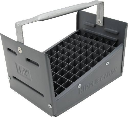 Made of high density polyethylene will not rust, corrode or cause nipples to rust material tested to minus 40°f will withstand harsh chemicals and oils when bent or crushed will spring back into shape leaving no permanent damage weep holes at bottom designed to keep nipples out of water 1/2 inch caddy; holds 77 pipe nipples, 7-1/2 inch x 11-1/4 inch x 7 inch 3/4 inch caddy; holds 66 pipe nipples, 8 inch x 13-3/4 inch x 7.