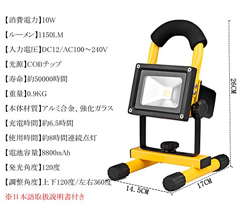 - 【充電式】コードレスで充電完了したら、コンセント要らず点灯可能、どこでも使用可能です。 更に、ポータブル式で持ち運びやすくて、アウトドア活動に最適です。キャンプ用のランタン、スポットライト、防犯ライト、夜釣り、作業灯、車の整備など夜間照明に活躍しています。