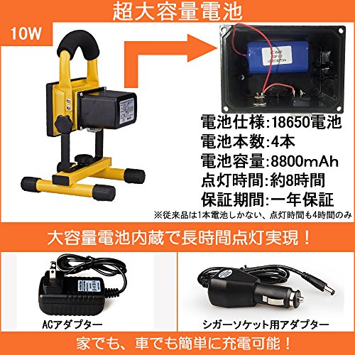 LED 投光器 10W 充電式 ホワイト(6500K) 1150LM バッテリー内蔵 長時間点灯可能 地震 防災対策 災害現場に大活躍 ポータブル式で運びやすい