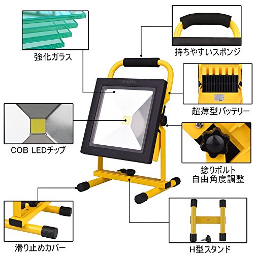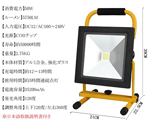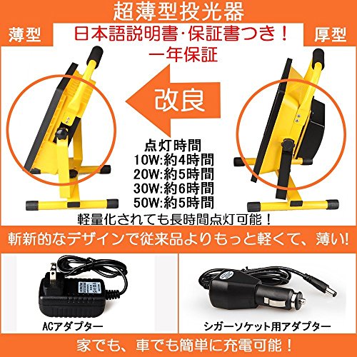 超薄型 50W LED投光器 充電式 バッテリー内蔵 5750LM 6500K ホワイト 防水防塵 長時間点灯 軽量化持ち易い