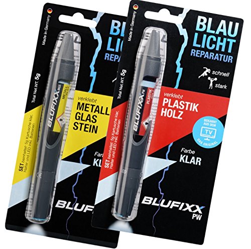 ブルーフィックス(Blufixx)はドイツ生まれで、従来の接着剤では対応できなかった箇所の補修が行える画期的な製品です。ブルーライトで硬化しますので、乾くまで保持する必要もありません。速乾性、透明性にも優れています。A)金属・ガラス・石 B)プラスチック・木 2タイプあります。 セットでお買い上げいただくと便利です^^