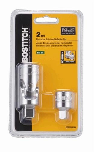 The BOSTITCH BTMT72281 1/2' Drive U-Joint and Adapter Set features a universal joint which helps greatly to provide access in hard to reach areas. There are anti-slip rings on these sockets to allow for easy gripping. Constructed of a chrome vanadium steel for added strength and durability.