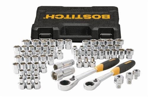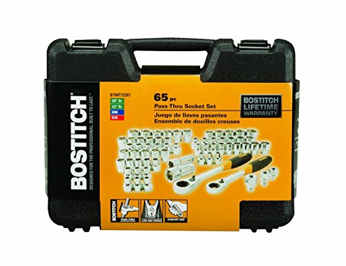 The BOSTITCH BTMT72287 65pc Pass Through Socket Set features heavy duty ratchets with 72-Tooth Gear System for low arc swing, high torque ratcheting & better accessibility. The Pass Through design allows access to fasteners that deep sockets cannot reach. The ratchet handle is enhanced with rubber grip for comfort. The sockets have durable stamped size markings for easy socket size identification. Constructed with chrome vanadium steel construction for added strength and durability. Includes a durable blow mold case for tool portability and protection.
