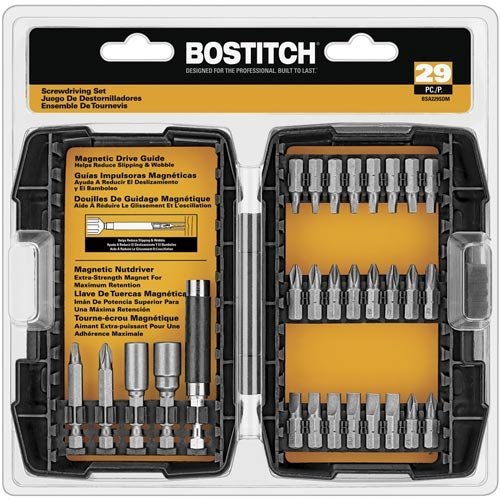 The BOSTITCH BSA229SDM 29-pc. Screw driving Set features a compact magnetic drive guide which reduces slipping and wobble. This set is constructed with shock resistant steel for longer life, and is heat treated to reduce breakage and wear. 1/4 inch hex shank. This 29pc screw driving set is designed for general project screw driving needs. Set Includes: (1) 1/4' Nutsetter, (1) 5/16' Nutsetter, (1) Compact Magnetic Drive Guide, (2) #1 Phillips Bit Tip, (7) #2 Phillips Bit Tip, (1) #3 Phillips Bit Tip, (1) #2 Phillips Power Bit, (2) #6 Slotted Bit Tip, (2) #8 Slotted Bit Tip, (2)#10 Slotted Bit Tip, (2) #1 Square Bit Tip, (4) #2 Square Bit Tip, (2) #3 Square Bit Tip, (1) #2 Square Power Bit.
