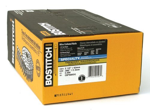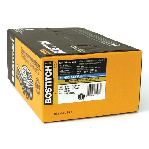 Stanley Bostitch C8P90BDG 3,600 Count 2-1/2' x .092 Smooth Shank 15 degree Coil Siding NailsStanley-Bostitch manufactures top-quality, innovative fastening tools and fasteners for industrial, construction and home improvement applications. Products include pneumatic staplers and nailers, compressors, manually operated staplers and tackers, coil-fed screw systems, rivet tools, glue guns, a broad assortment of collated nails, screws, staples and specialty fasteners in a variety of materials and finishes, plus office products and carton-closing staplers - many of them industry firsts. Stanley Bostitch C8P90BDG 3,600 Count 2-1/2' x .092 Smooth Shank 15 degree Coil Siding Nails Features: Use in Nail Gun N65CP-1 Plain shank Galvanized Diamond point 2-1/2'Stanley Bostitch C8P90BDG 3,600 Count 2-1/2' x .092 Smooth Shank 15 degree Coil Siding Nails Specifications: Fastener Length: 2-1/2' Fastener Shank Diameter: .092 Finish: Thickcoat?'? Fits Bostitch Tools: N63CP, N64C, N66C, N66BC, N75C Fits Competitor Tools: Hitachi: NV65AH (1-1/2-2-1/2); Makita:AN611 (1-1/4-2-1/2); Max:CN565 (1-1/4-2-1/2); Porter Cable:COIL200 (1-1/4-2), COIL250 (1-1/2-2-1/2) Point Style: Blunt Diamond Quantity Per Item Pack: 3,600 Shank Type: Smooth