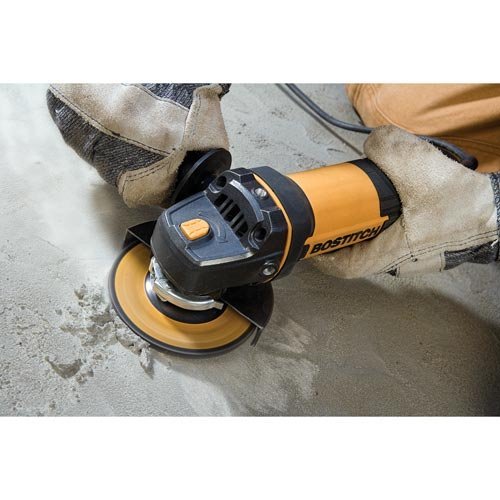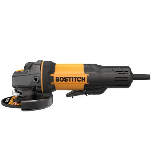 The BOSTITCH BTE820K 7 amp 4-1/2" Angle Grinder Kit features a powerful 7.0 amp motor which delivers plenty of power for tough applications and 11,000 RPM for high speed material removal. It has a metal gear case that provides additional durability and helps dissipate heat away from internal components. An adjustable 3 postition side handle provides improved control in multiple cutting and grinding applications. It has a tool-free guard that provides quick guard adjustments and easy changes between cutting and grinding guards. A non-locking paddle switch delivers additional control by automatically shutting off if dropped during use and a spindle lock allows for easy accessory changes with wrench. Kit includes: (1) BTE820 4-1/2" Angle Grinder, (1) Grinding Wheel, (1) Grinding Guard, (1) Cut-off Wheel, (1) Metal Cutting Guard, (1) Side Handle, (1) Wrench and Kit Box.