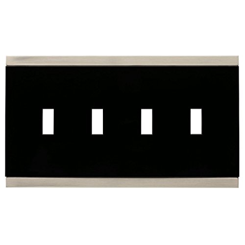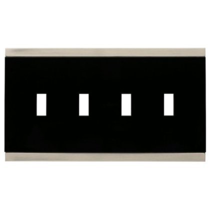 WARNING: Risk of electric shock. Turn off power at fuse box or circuit breaker before installation. CAUTION: Wall plate edges may be sharp. Handle with care.. Quad Switch Wall Plate. Satin Nickel and Black finish. Fasteners included. The Basic Stripe collection, with an easy slide-in insert that hides the fasteners, complements your home with a sleek, comtemporary look. Decorative wall plates are simple way to transform the look of any room. This collection is available in today’s most popular finish options. Additional configurations are available to make completing your project easy.
